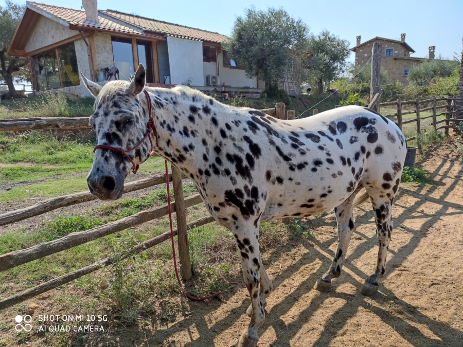 Questo è Pongo, un cavallo di una bontà smisurata, talmente sensibile che quando capisce di avere un cavaliere spaventato si ferma e aspetta.